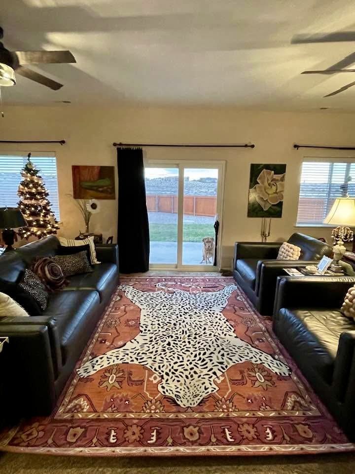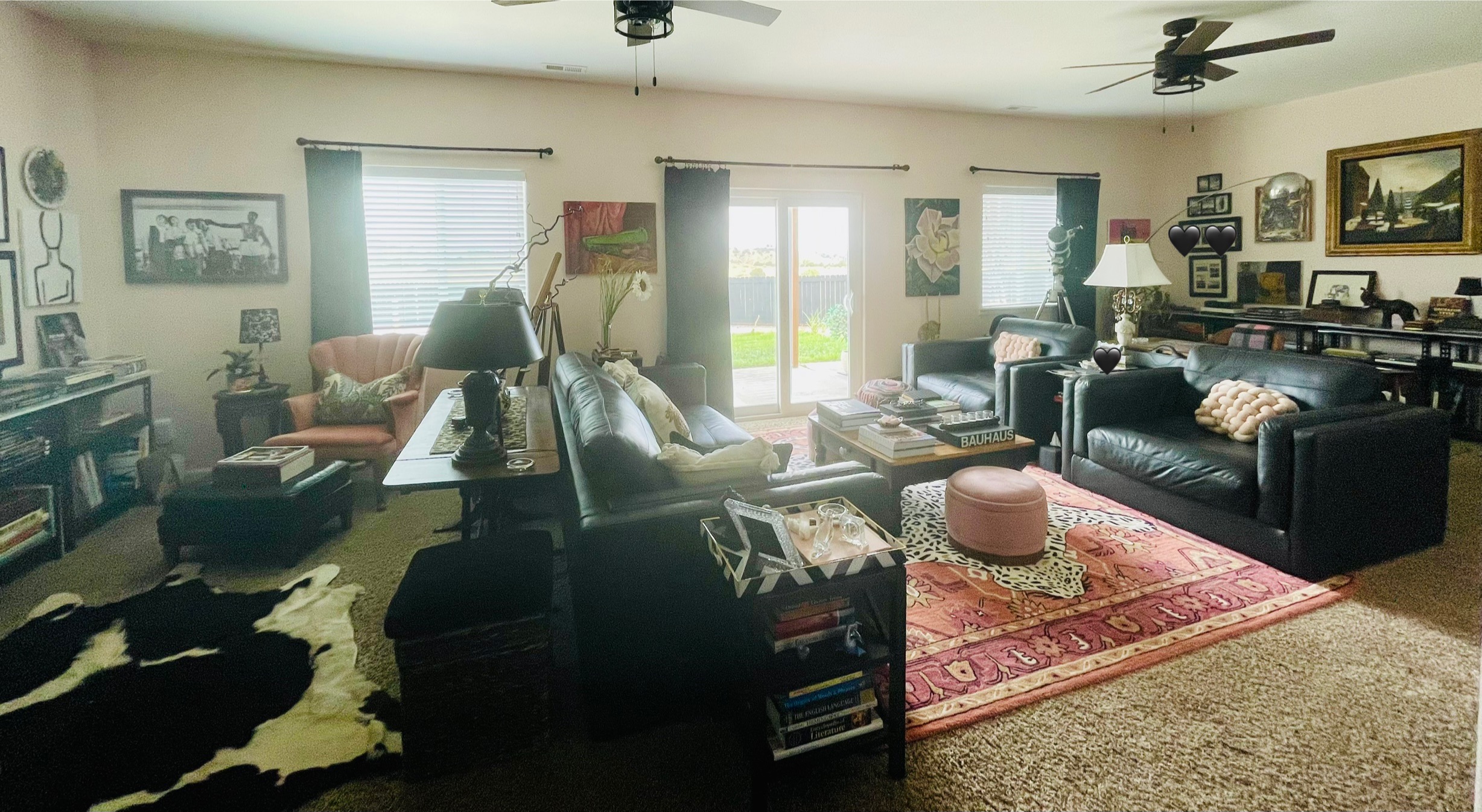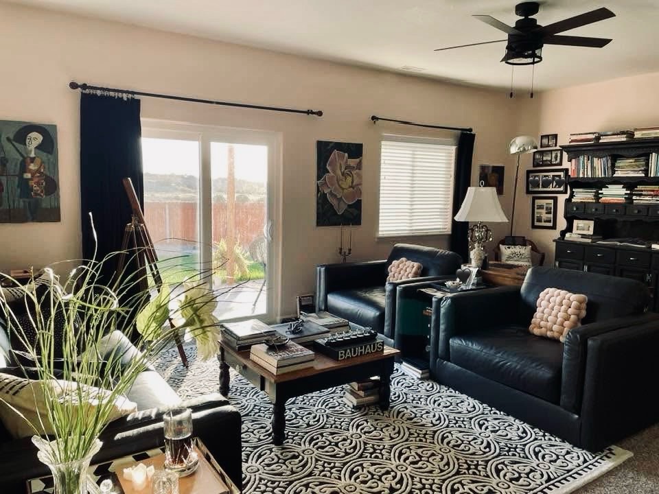 I knew I would be offsetting the pinkishness with more masculine elements, such as the massive black leather couches. Additionally, the black metal bookshelves offer a more industrial vibe. In all, it’s a perfect balance.