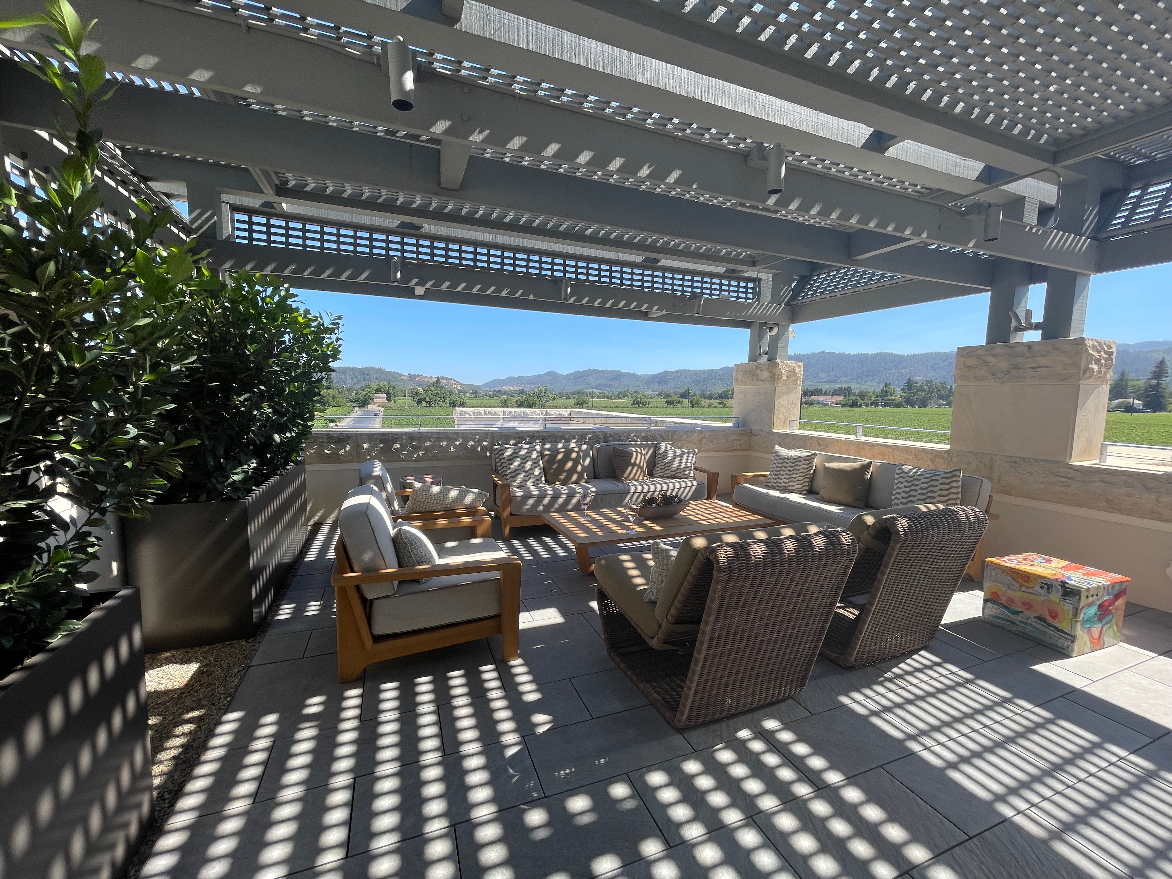 Once the hostess arrived, carrying our wine glasses on a tray, she led us up the travertine steps to the rooftop terrace. It was relatively quiet up there, and after the hostess kindly took our picture, she proceeded to leave us unattended for the rest of our visit. No refills. No water. No crackers. Crickets.