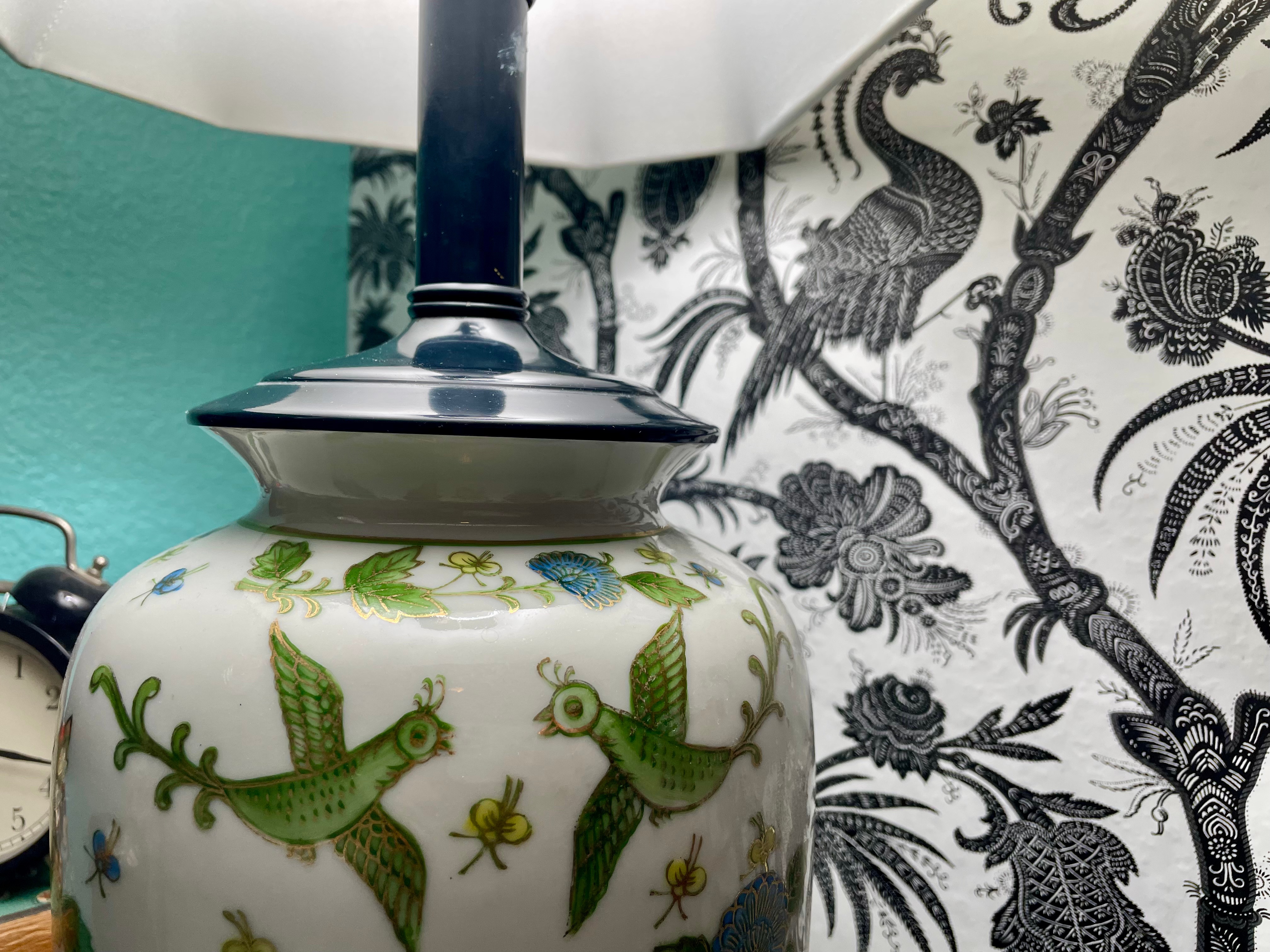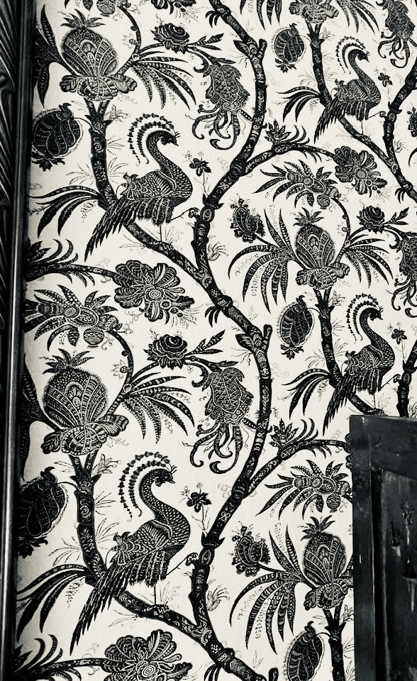 The Balinese Peacock wallpaper is an updated pattern pulled from old prints, which I have seen in several older homes through the years. I’ve generally seen it in French blue, and sometimes in lavender, although Scalamandre makes it in various colourways. My favourite of which is my beloved black.