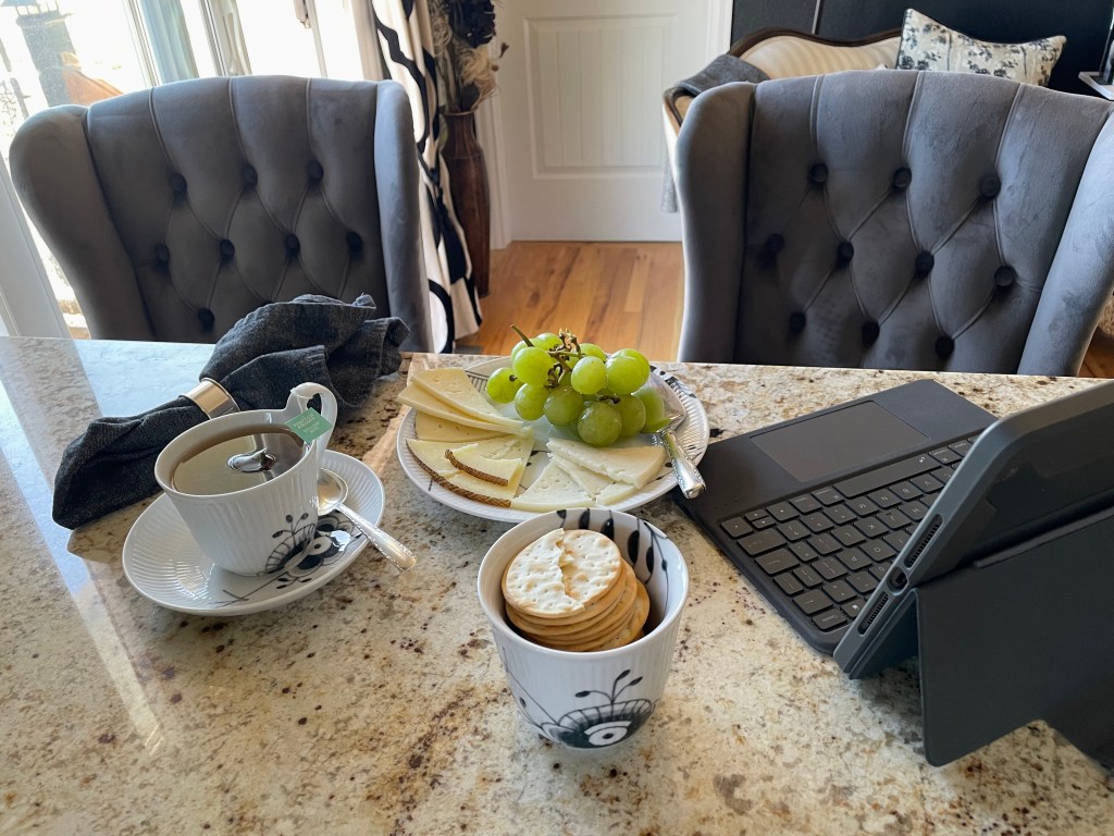 9:00 is The Official Start to the English Maximalista’s Work Day, Mon-Fri. Depending on whether Mr M is on a conference call, I will head back to my boudoir to do some work online; otherwise, if he’s talking in his office, I will take my iPad downstairs to our family room, and work from there.